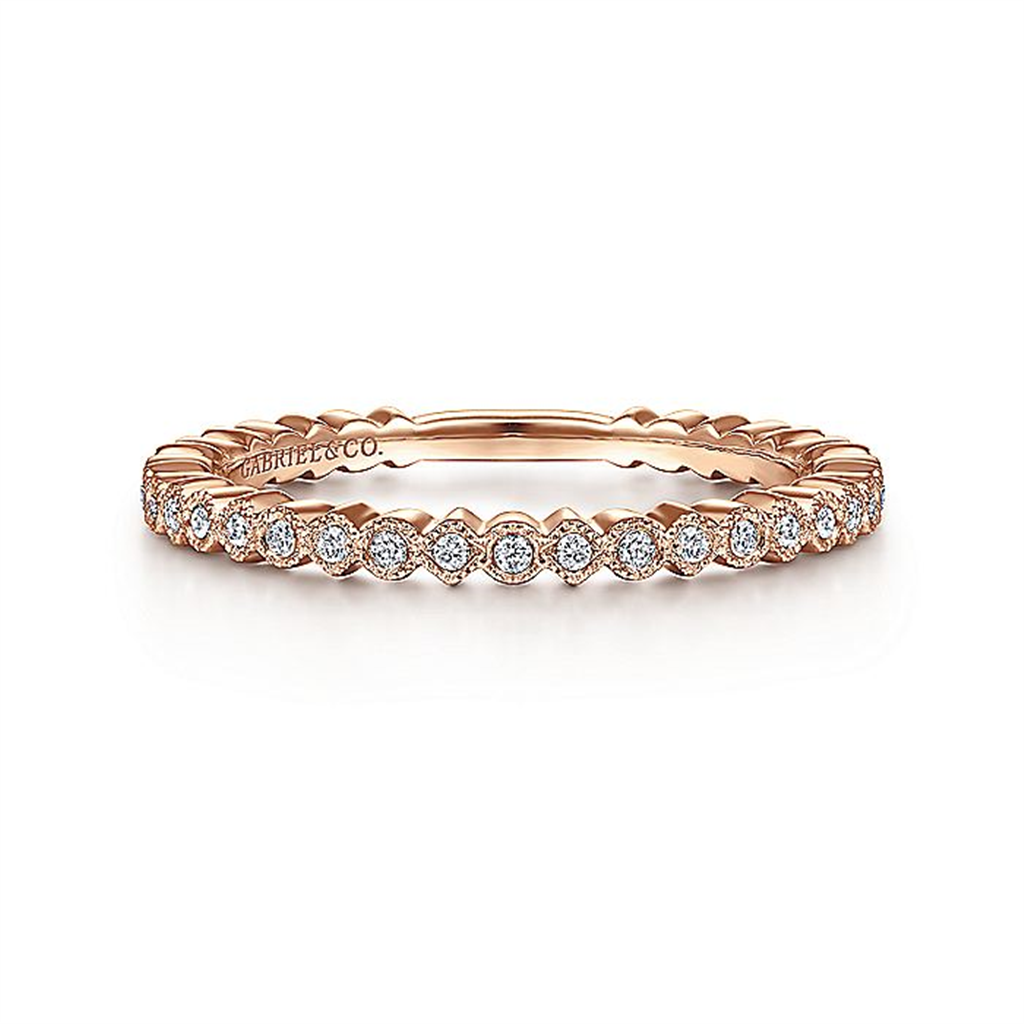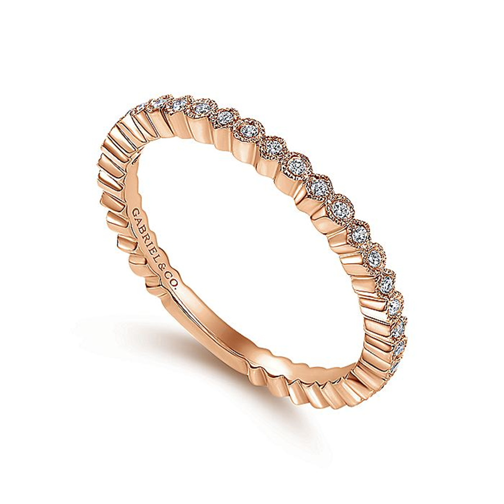 Iridescent 0.13ct diamonds light up this stackable fashion ring. Alternating round and square shapes encircle each precious stone, creating a scalloped band to this 14K rose gold design.