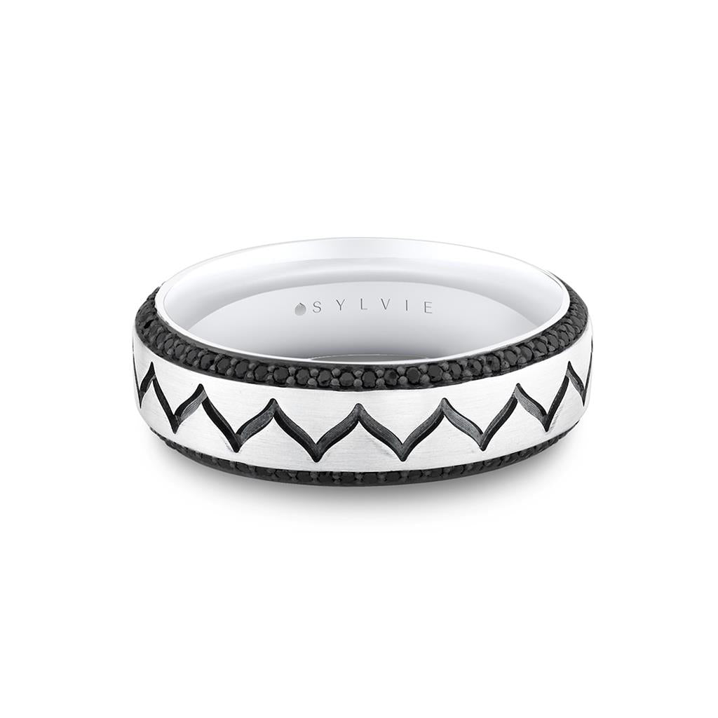 14K White Gold Black Diamond Wedding Band With Zig Zag Pattern
