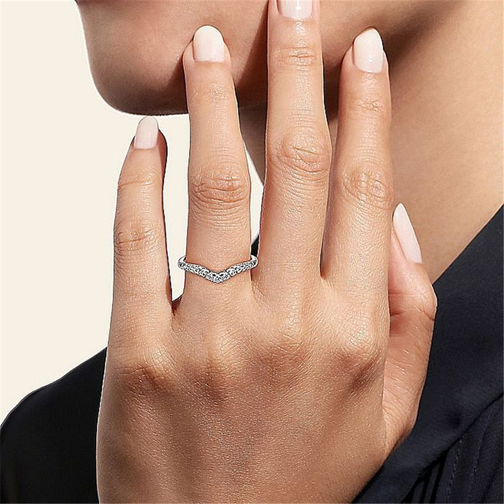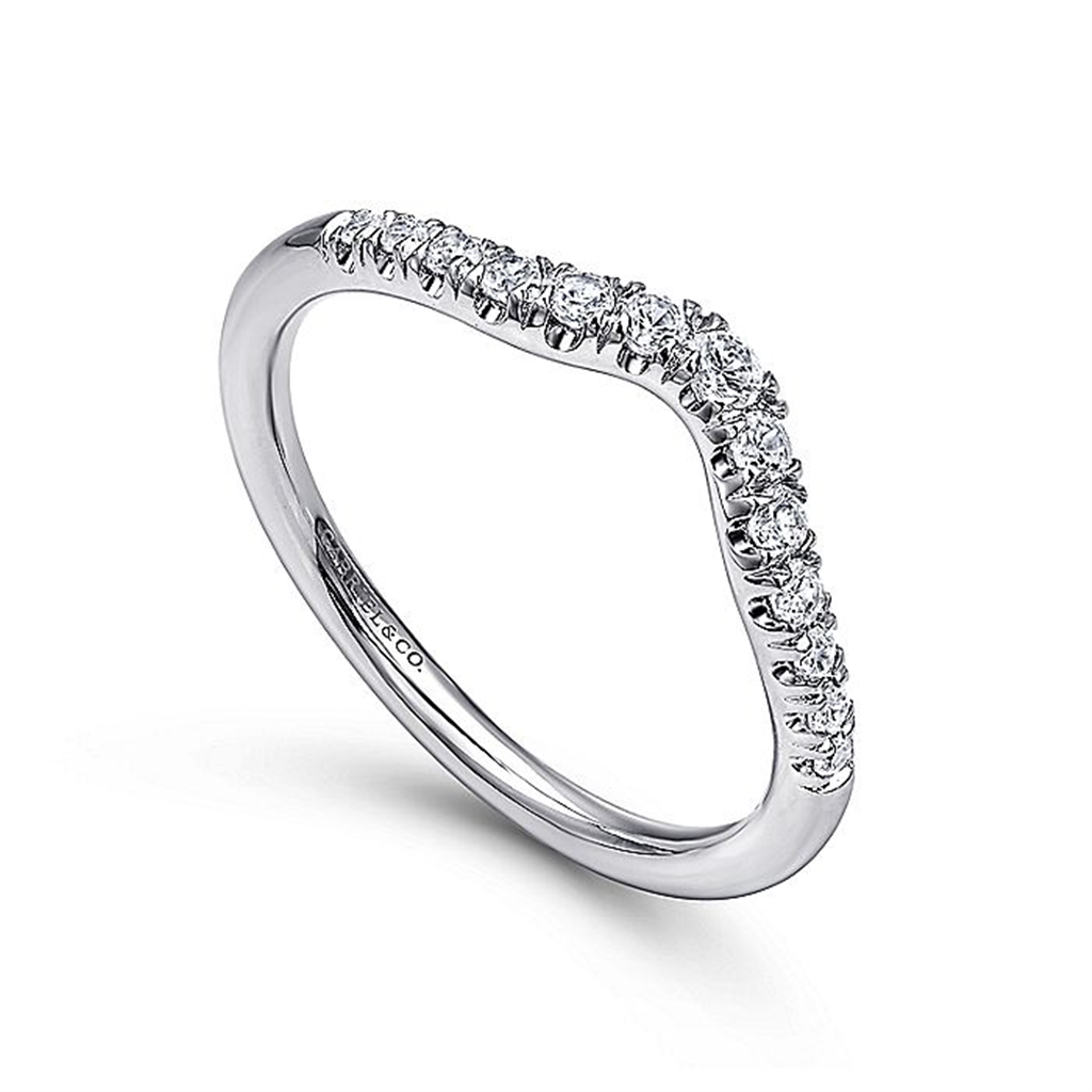 This subtly curved white gold and French pave diamond anniversary band is designed specifically to align with your engagement ring.