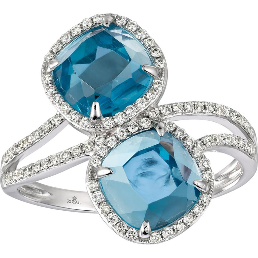 14K White Gold Cushion Blue Topazes And Diamond Toi Et Moi Ring