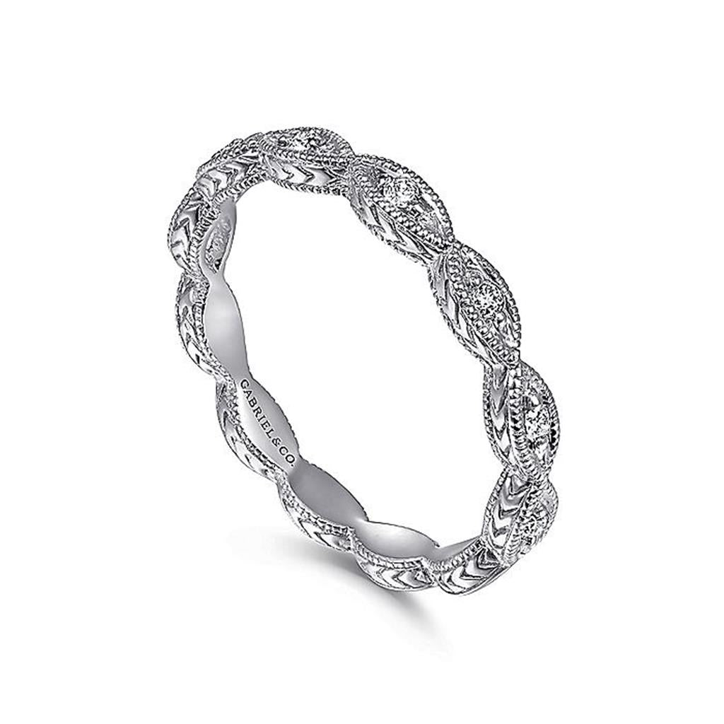 Luminous 14K white gold ring designed for stacking featuring brilliant 0.10ct diamonds. Marquise shapes create a scalloped silhouette, elevated with milgrain borders and engraving along the profile of the stackable band.