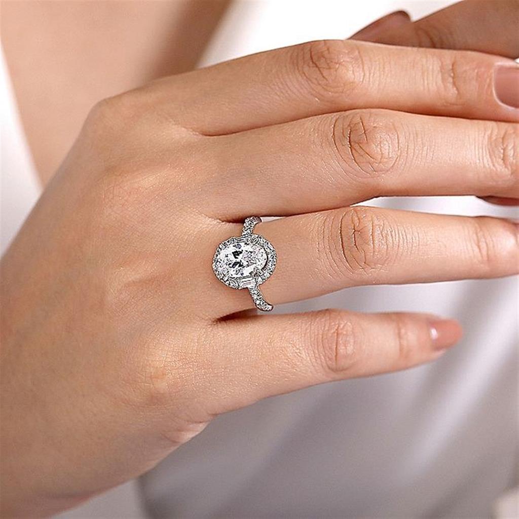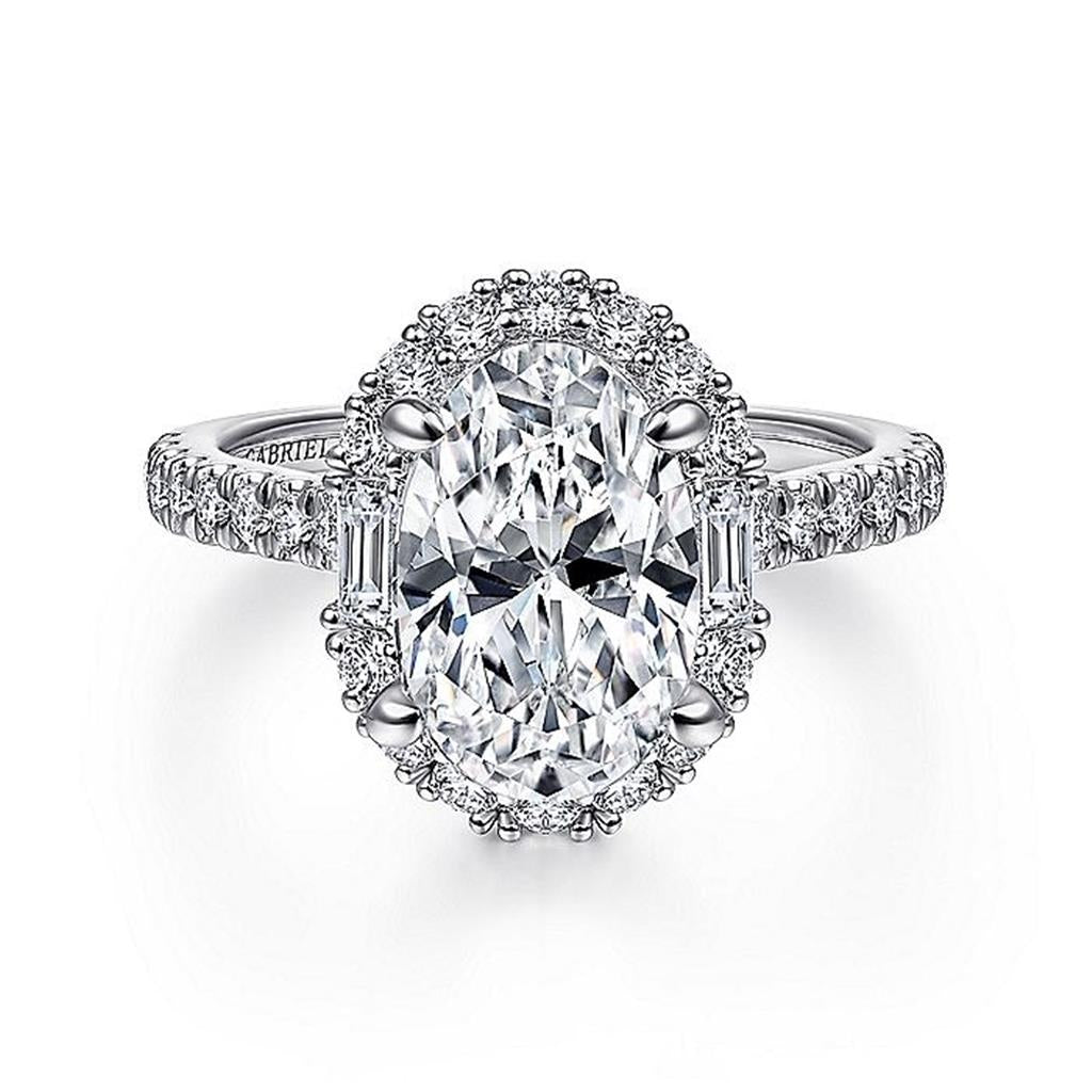Boost the radiance of your 2ct oval cut center stone with a sparkling halo featuring round and baguette diamonds. Constructed from rich 14K white gold, this 0.82ct diamond engagement ring setting also boasts a slim straight band and curved gallery trimmed with sparkling pavé diamonds.