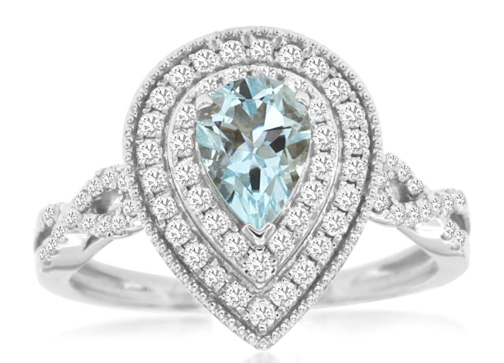 14K White Gold Pear Aquamarine And Diamond Halo Ring