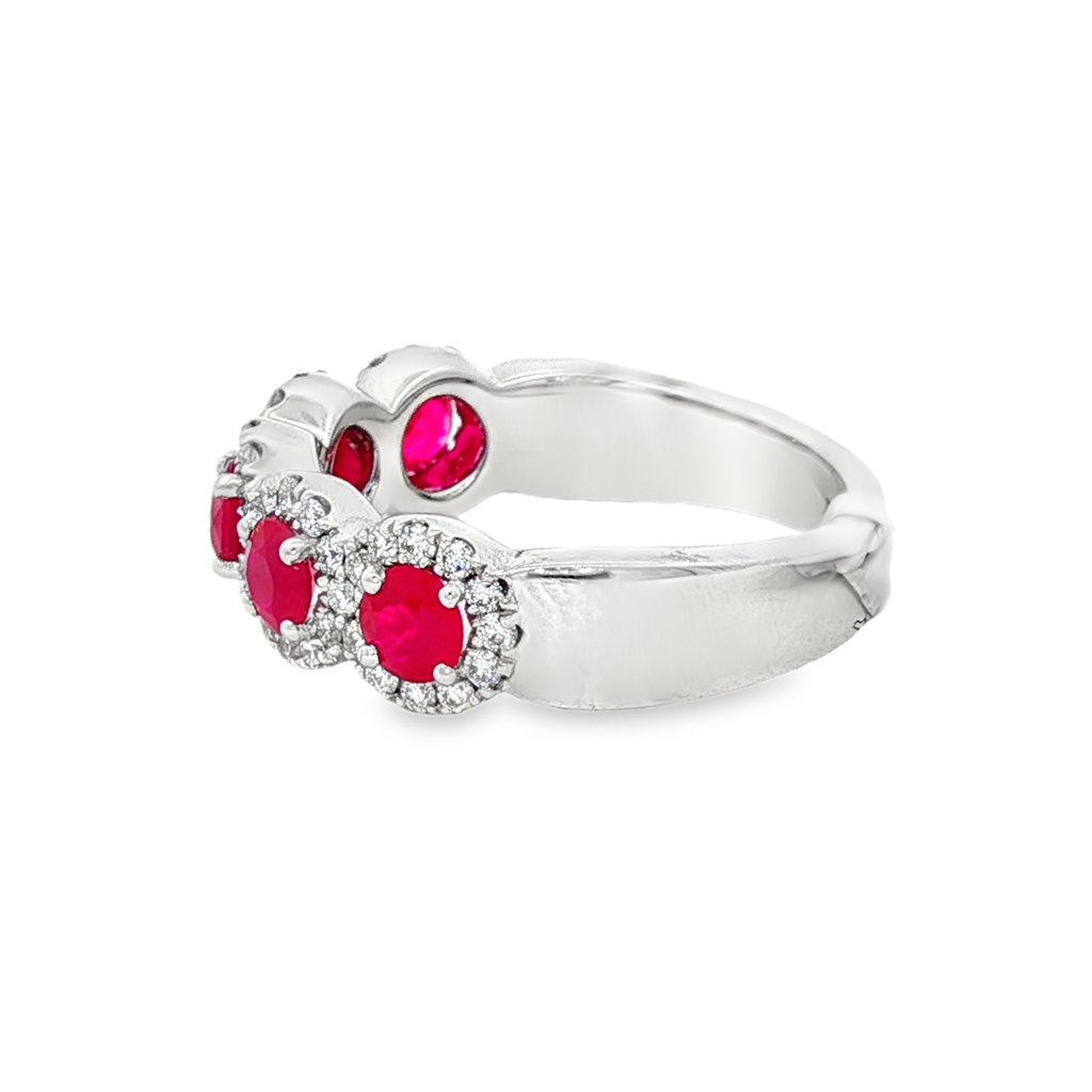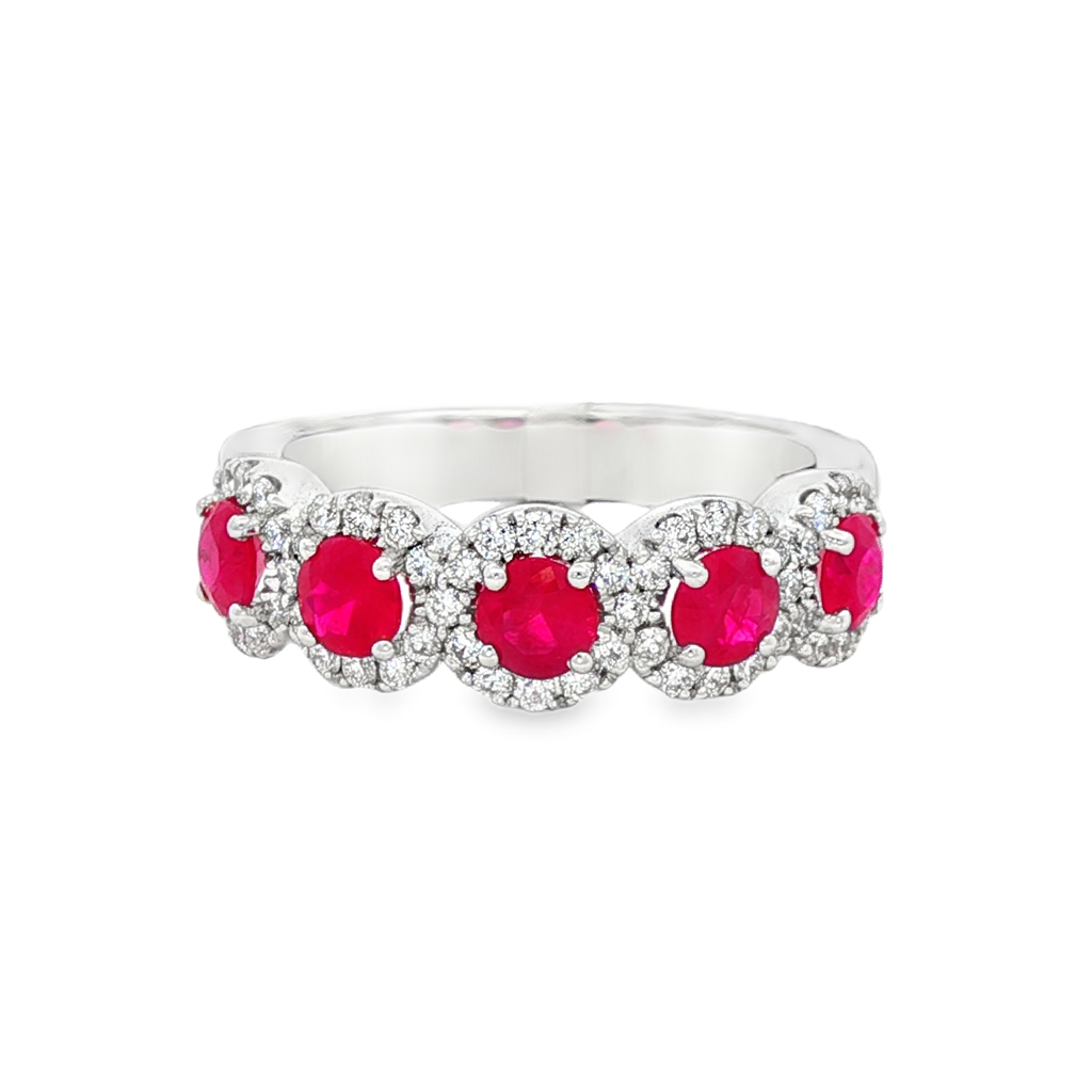 14K White Gold Round Rubies And Diamond Five Stone Ring
