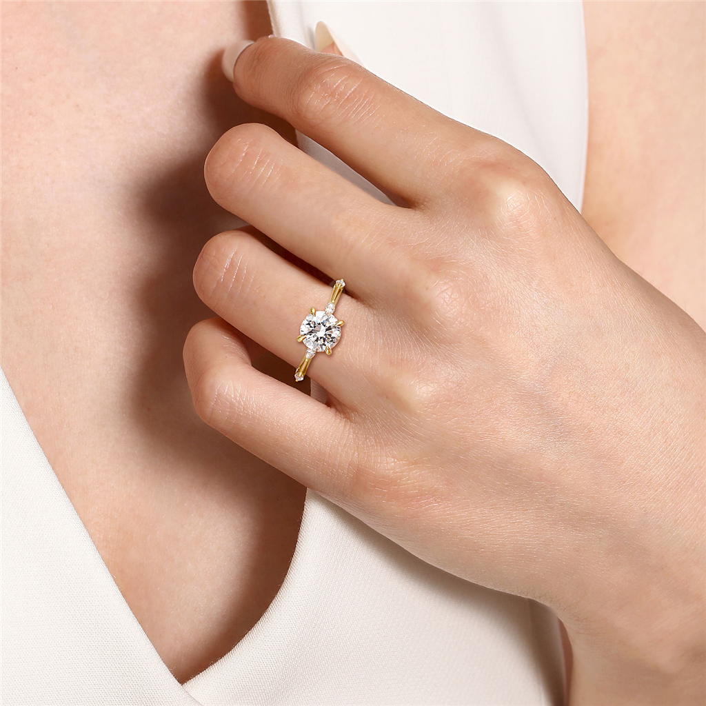 A true embodiment of timeless sophistication, this 14K yellow gold engagement ring invites you to embark on a journey where each diamond station twinkles at every turn. At its heart, a radiant 1.5 ct round-cut diamond commands attention, cradled in a lower minimal head and secured by a single-prong setting that enhances its brilliance. Along the shank, 0.16 ct diamond stations unfold, creating a mesmerizing path of light and grace.