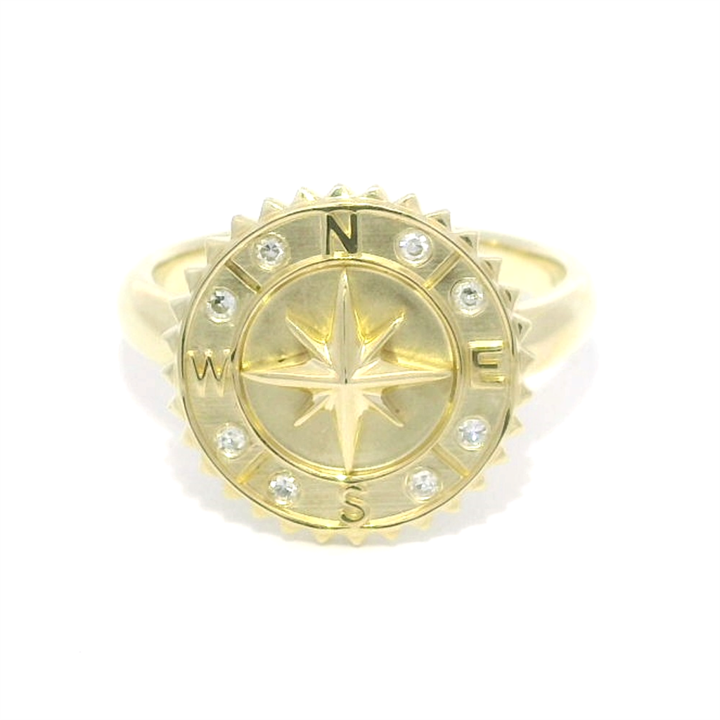 14K Yellow Gold Satin Finish Compass Medallion Diamond Ring