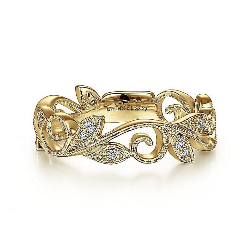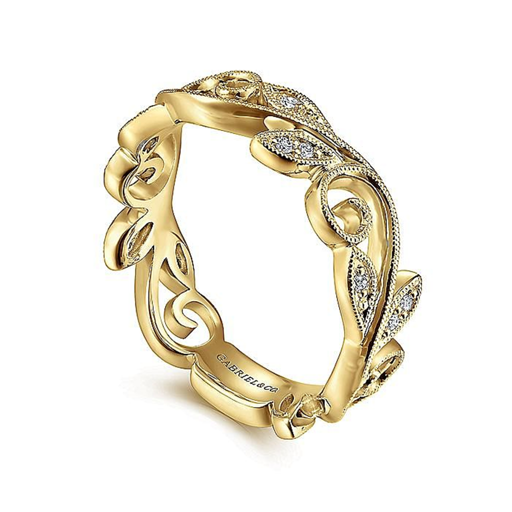 This nature inspired stackable ring features elegant milgrain-embellished scrollwork. Delicately sculpted leaves are interspersed along the band, each adorned with sparkling accent diamonds