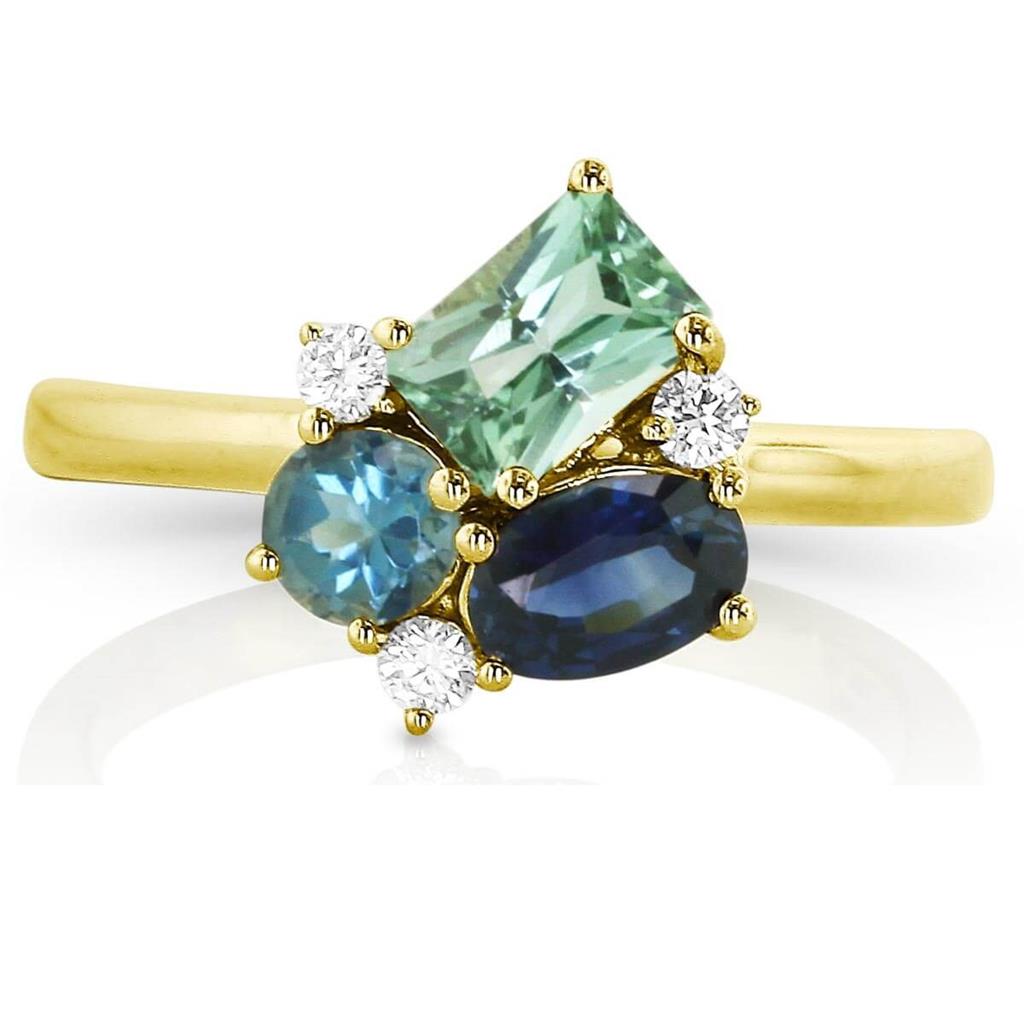 • Stones: (1) 0.61Ct Emerald Cut Tourmaline (1) 0.60Ct Oval Sapphire (1) 0.27Ct Round Blue Topaz (3) 0.11Ct Round Brilliant Cut Diamonds