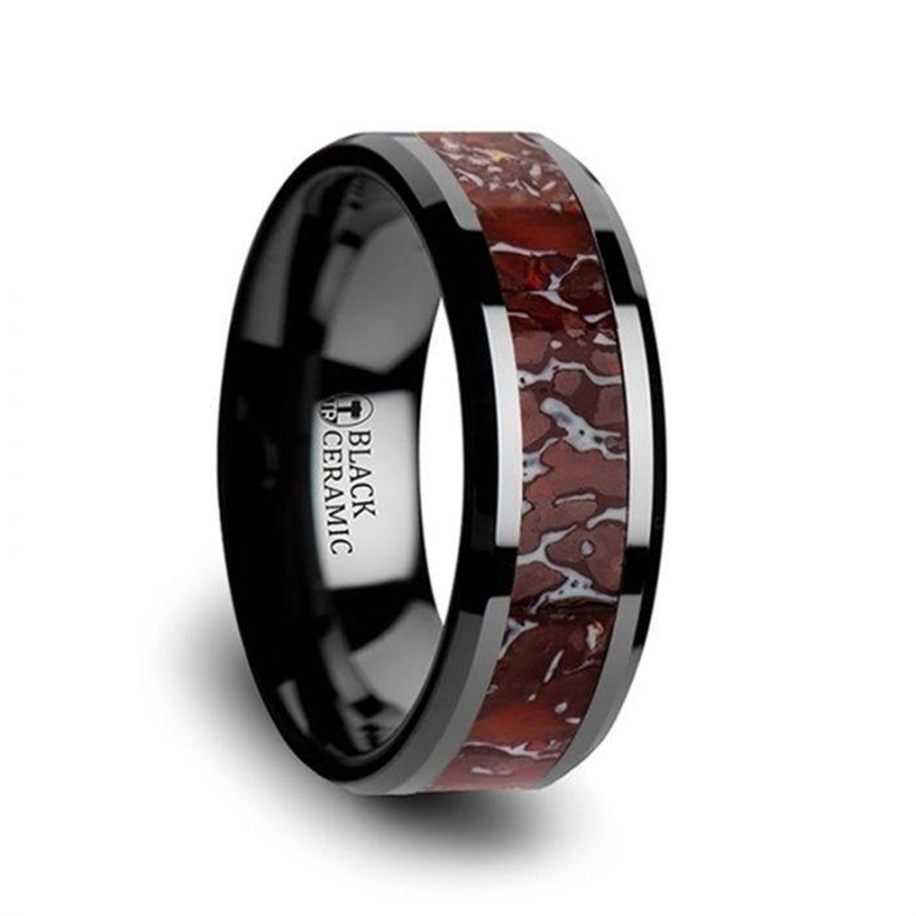 Black Ceramic ‘Triassic’ 8mm Red Dinosaur Bone Inlaid Beveled Edge Wedding Band