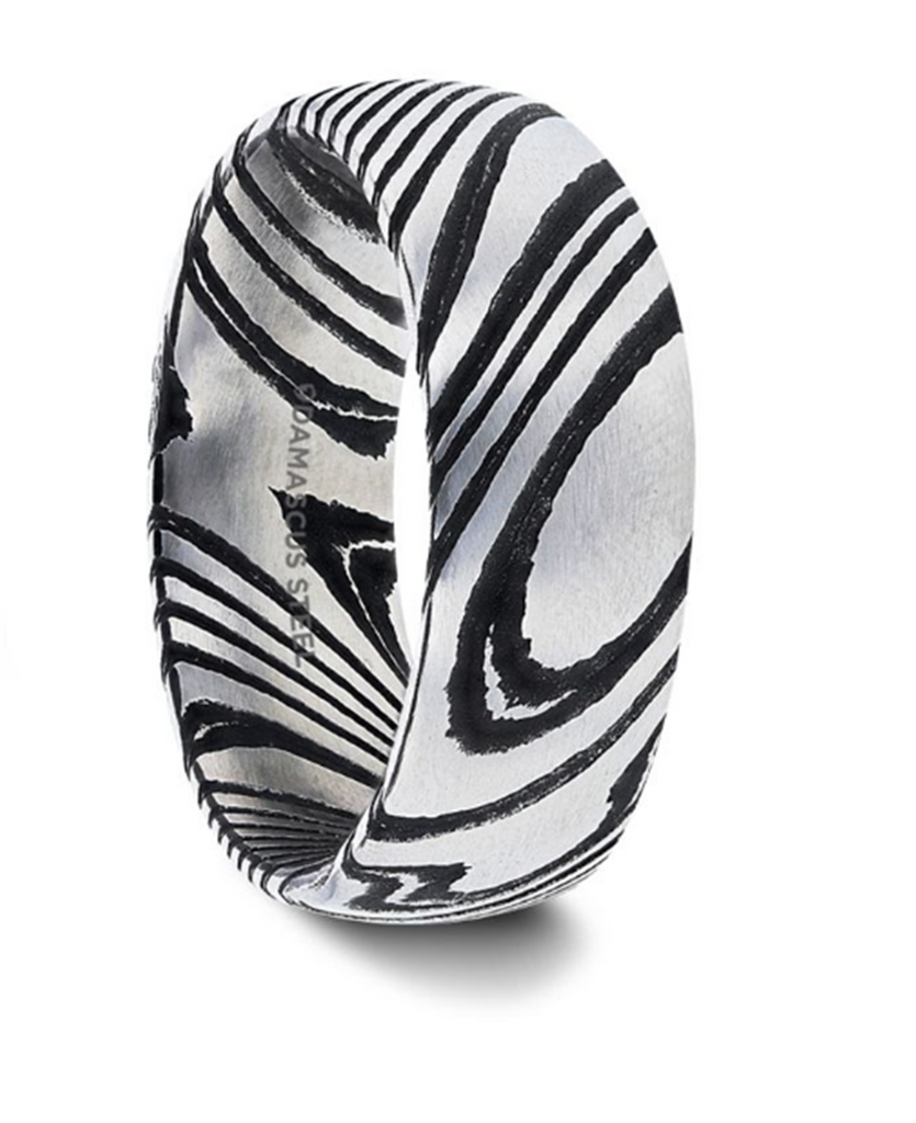 Black Domed Brushed Damascus Steel ‘Stark’ Vivid Etched Design 6mm Men’s Wedding Band