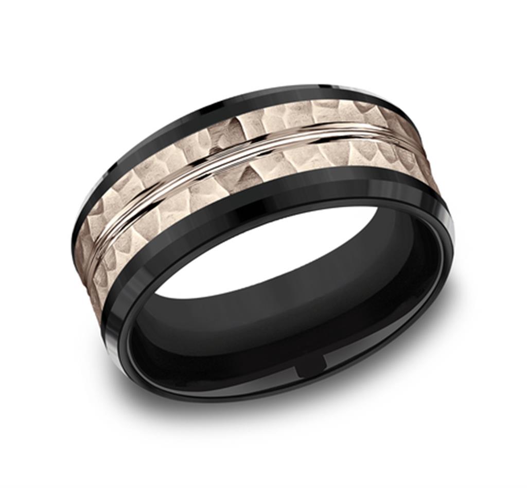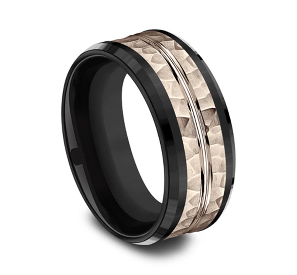 Black Titanium And 14K Rose Gold ‘The Ridley’ Hammered Finish 9mm Wedding Band