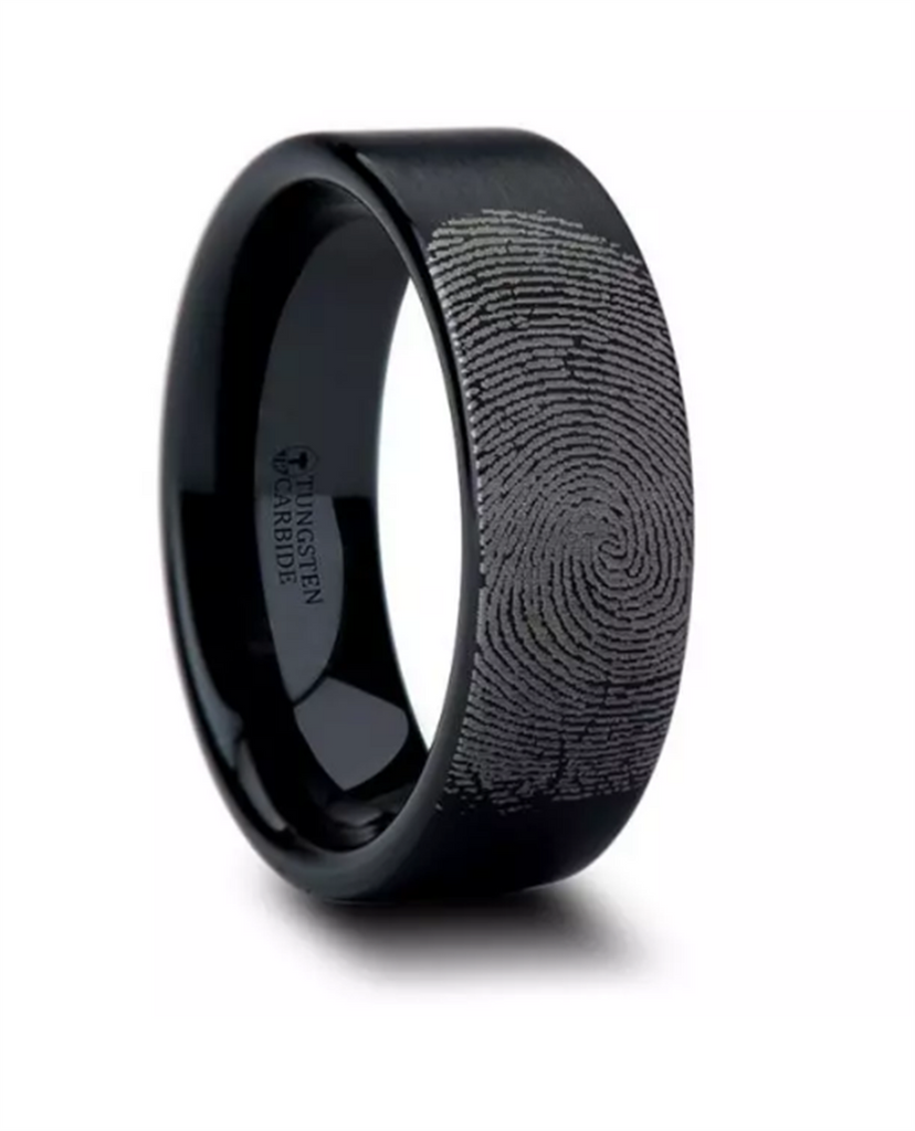 Black Tungsten ‘San Antonio’ Fingerprint Engraved Flat Pipe Cut Wedding Band