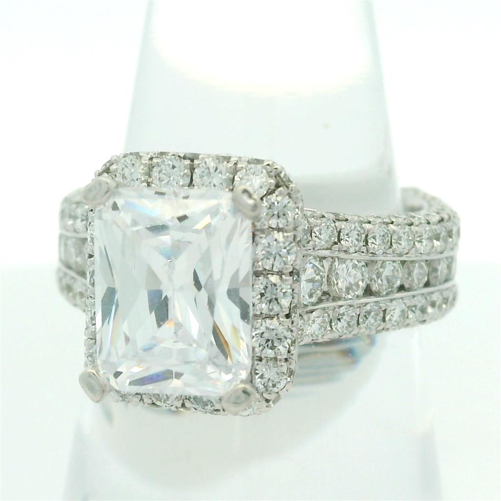 18K White Gold Halo Diamond Ring With (1) Emerald Cut And (132) Round Diamonds 2.82Ctw Ring Size 6