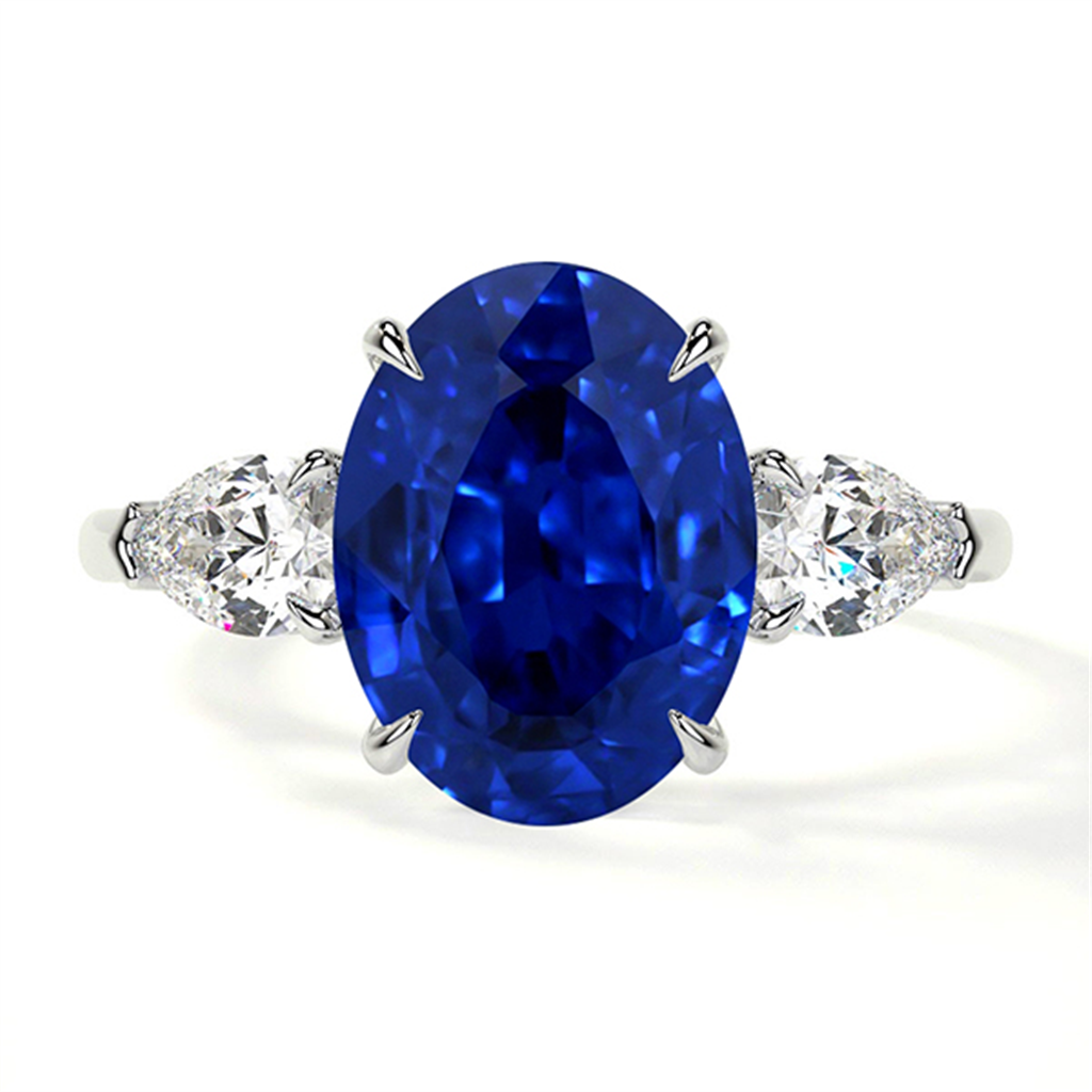 Platinum Three Stone Ring With1=1.16Ctw 8x6Mm Oval Sapphire And 2=0.28Ctw 3x3Mm Pear Diamonds, Size 6.5