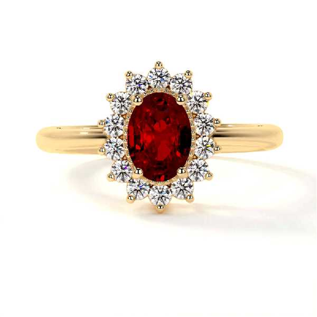 14K Yellow Gold Halo Ring With1=0.81Ctw 7x5Mm Oval Ruby And 14=0.31Ctw 1x1Mm Round Diamonds, Size 6.5