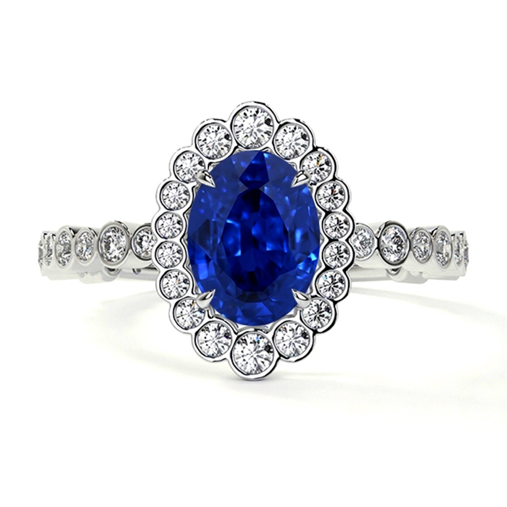 Platinum Halo Ring With1=0.95Ctw 7x5Mm Oval Sapphire And 38=0.42Ctw 2x2Mm Round Diamonds, Size 6.5