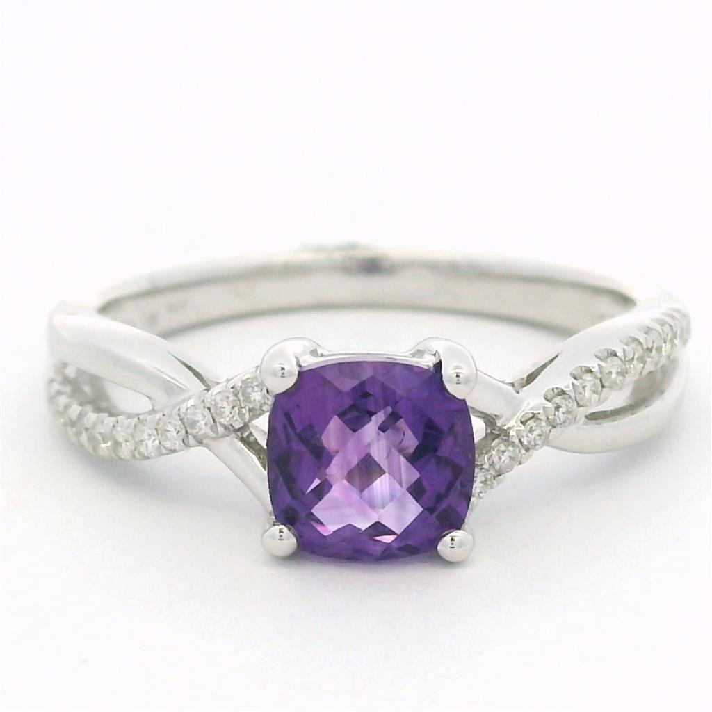 14K White Gold Contemporary Ring With1=0.75Ctw Checkerboard Cushion Amethyst And 22=0.113Ctw Round Diamonds, Size 7