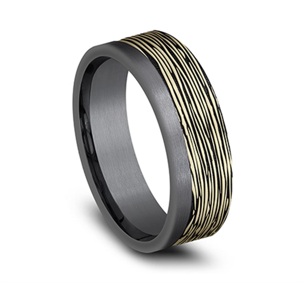 Darkened Tantalum And 14K Yellow Gold ‘The Aspen’ Horizontal Bark Pattern 7mm Wedding Band