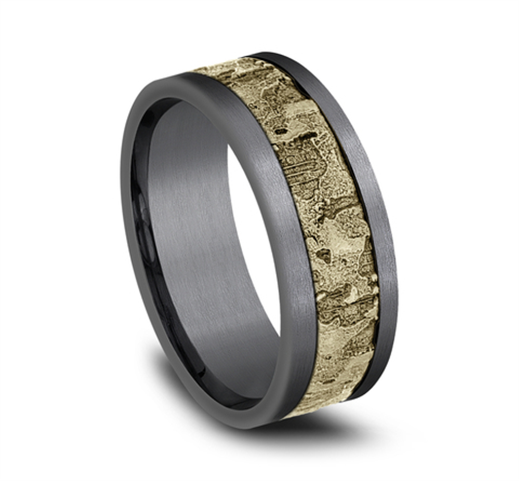 Grey Tantalum And 14K Yellow Gold 8Mm Wall Fracture Center And Grey Satin Edges Wedding Band