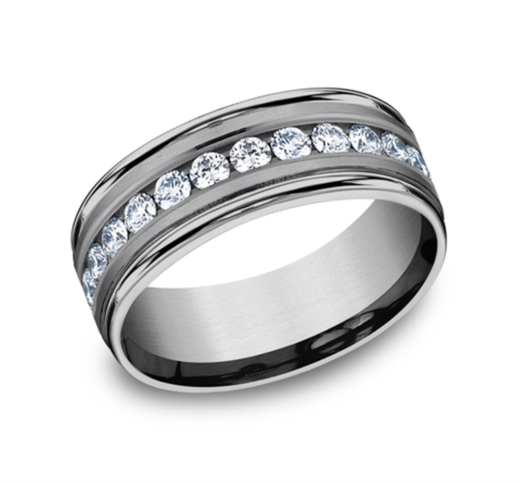 Grey Tantalum Satin Polish 8mm Channel Set Wedding Band With Diamonds