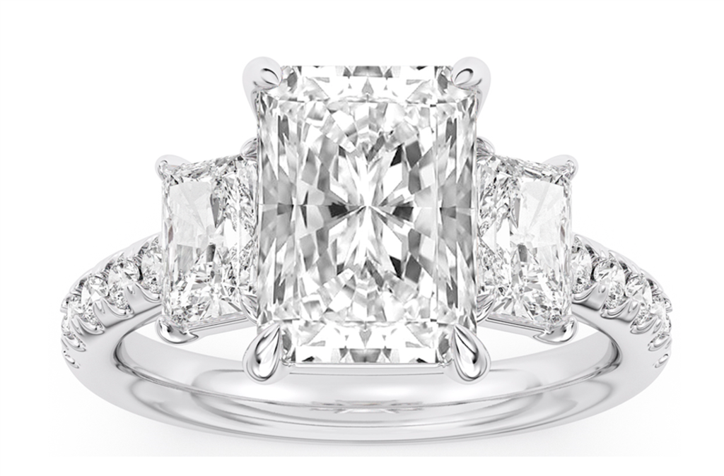 Lab Grown Diamond 14K White Gold Three Stone Diamond Ring With (1) Radiant Lab Grown Diamond 3.09CT And 12 =1.55CTW Round Lab Grown Diamonds Ring Size 7