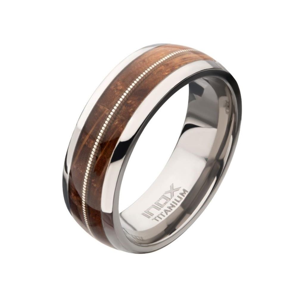 Titanium & Whiskey Barrel Wood Inlay with Embedded Guitar String Comfort Fit Ring