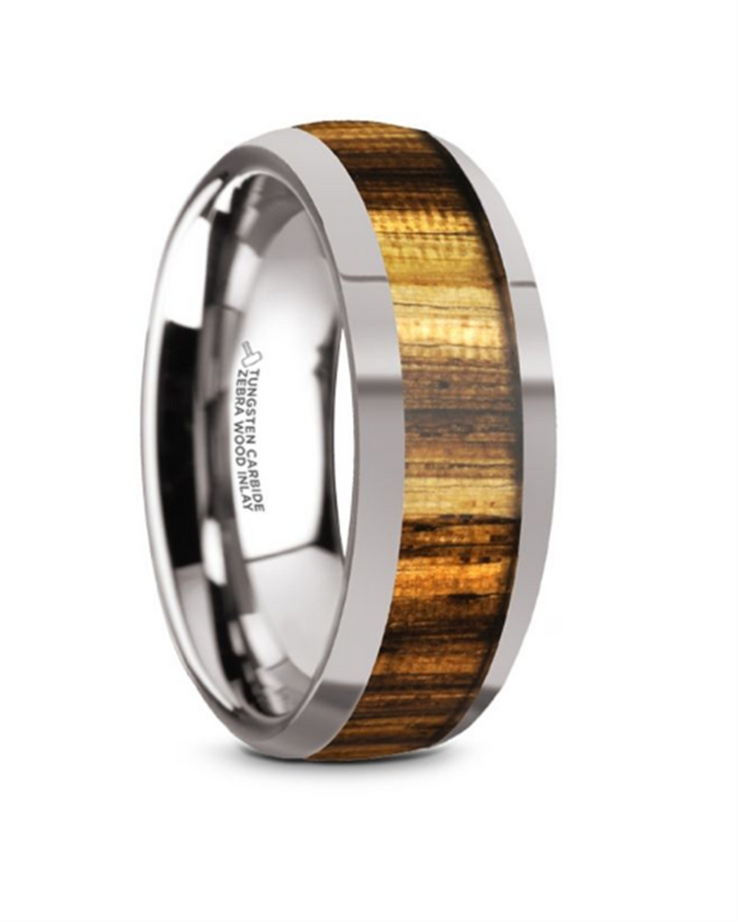 Tungsten Carbide ‘Tigre’ 8mm Zebra Wood Inlaid Domed Wedding Band