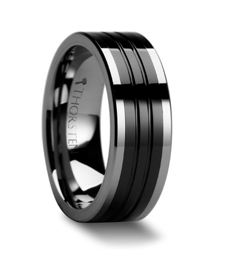 Tungsten ‘Edinburgh’ 8mm Flat Grooved Black Ceramic Inlay Wedding Band