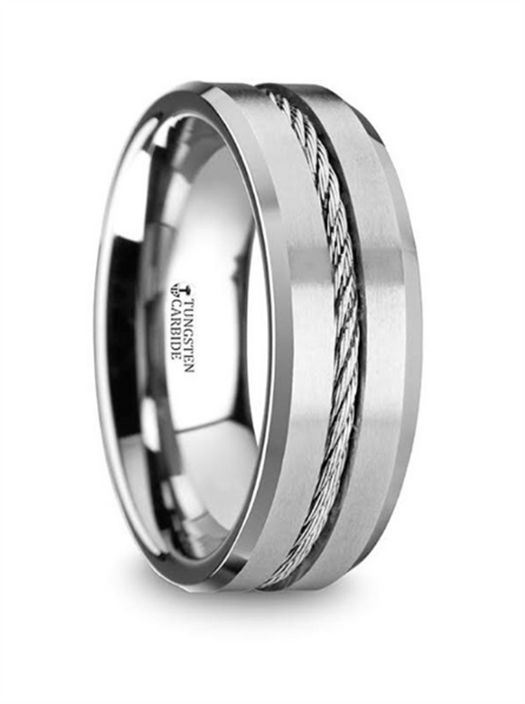 Tungsten ‘Lannister’ 8mm Steel Wire Cable Inlay Flat Wedding Band