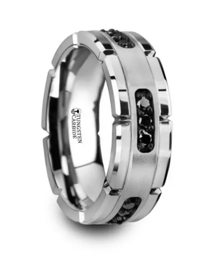 Tungsten ‘Valor’ 8mm Silver Inlay With Black Diamonds Grooved Wedding Band