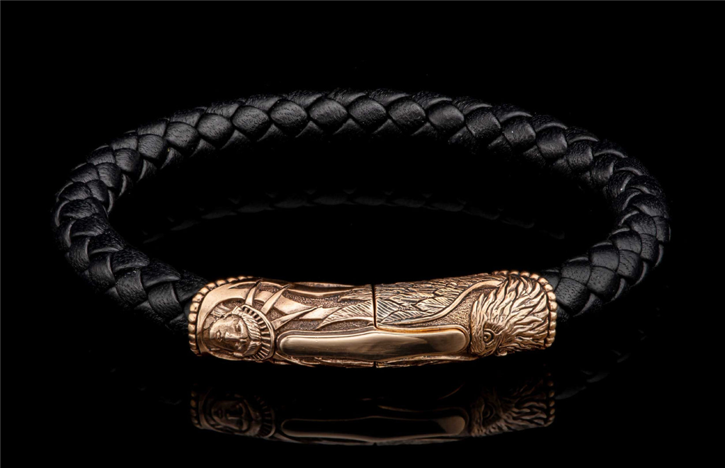 The Bryce Canyon brings our honored American heritage to life, timeless images sculpted from generations past, and for generations into the future. This bracelet features a beautifully carved centerpiece/clasp in bronze with a double secured magnetic closure. The soft warmth of the bronze is measured against a supple and durable 8mm braided leather cord in striking midnight black that wears well with any outfit, on any occasion.