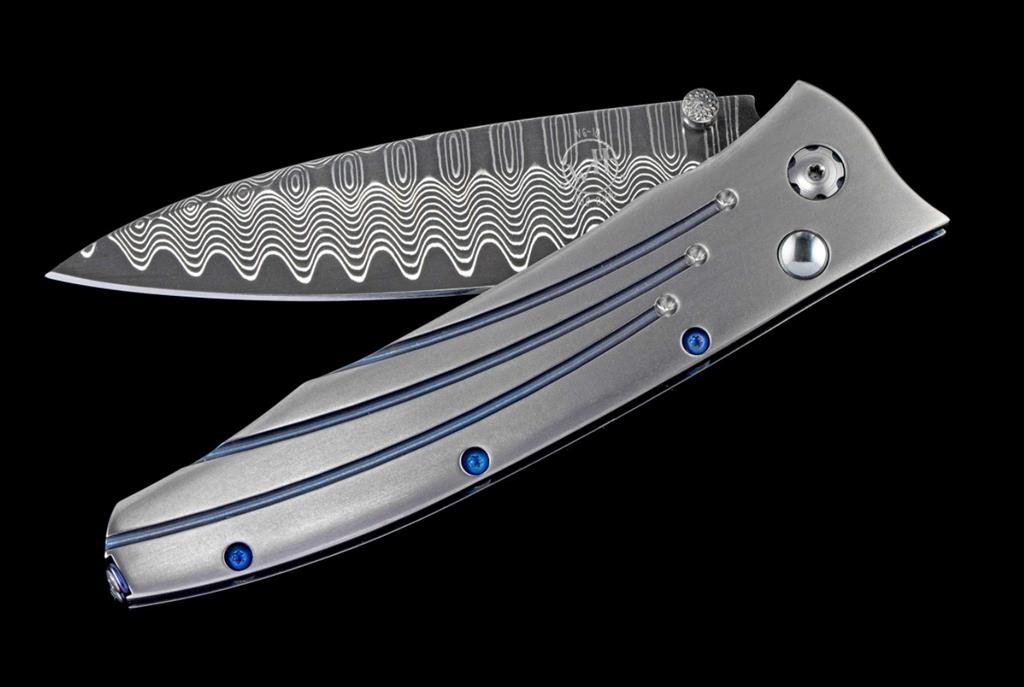 The Gentac ‘Saturn’ features a light and resilient frame in aerospace grade titanium, and a titanium pocket clip. The blade is extra-strong ZDP-189 steel; the one-hand button lock and the thumb stud are set with kashmir blue topaz. An exceptional design that offers rigorous performance in a sleek, comfortable knife, the ‘Saturn’ features some of the hi-tech and forged metals that are the hallmark of William Henry's collections; a distinctive personality statement to be worn and used for a lifetime.