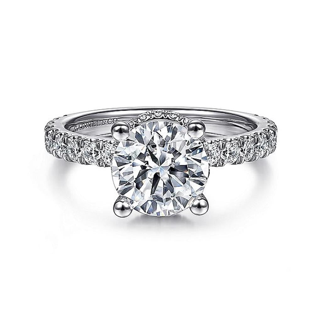 With each movement, this 0.73ct diamond engagement ring setting creates eye-catching splendor. The straight 14K white gold shank is encrusted with three-fourths of the way around with gleaming accent diamonds. A hidden halo encircling your round cut center stone adds surprise sparkle to this simple yet stunning ring.