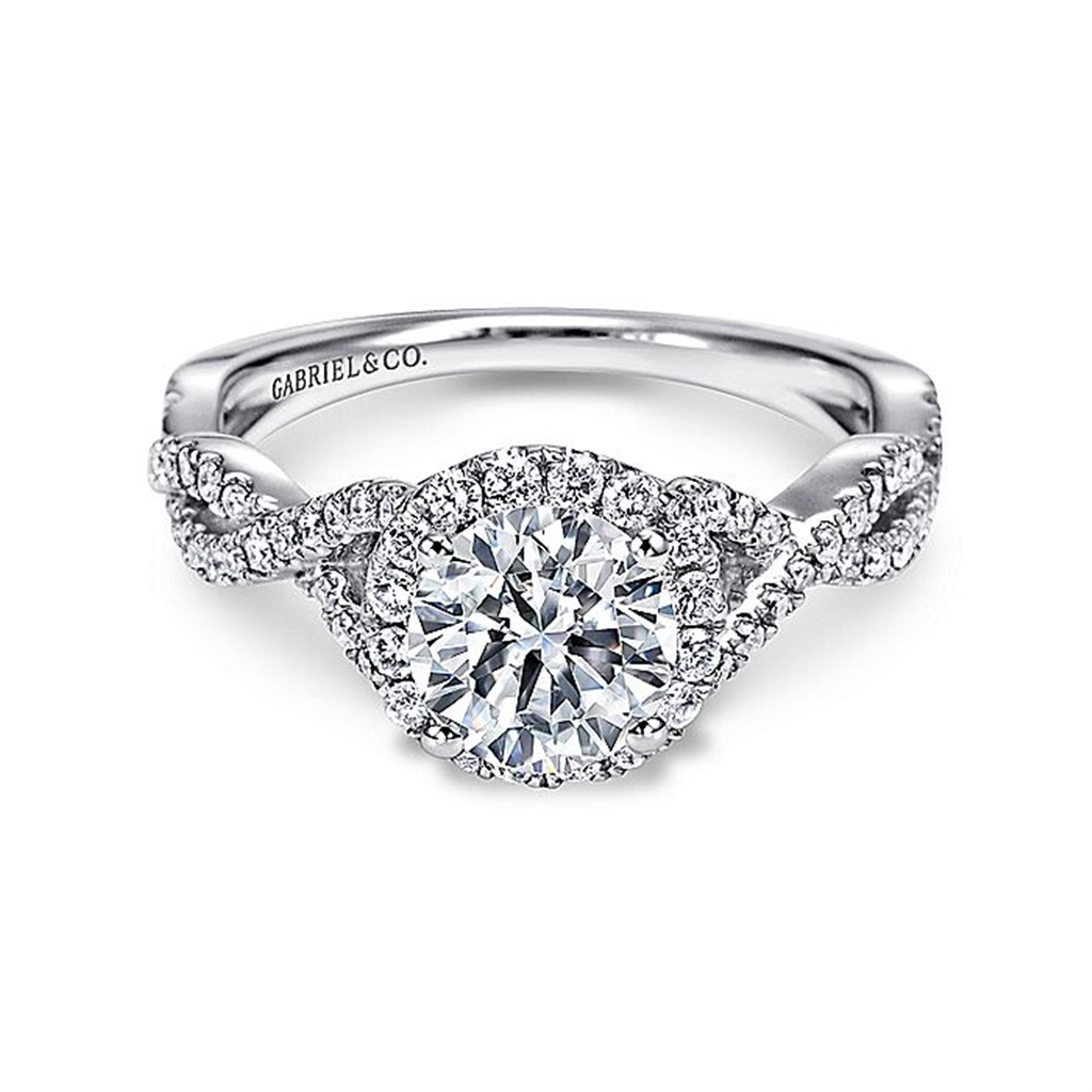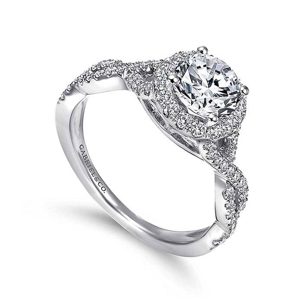 Create the ultimate memorable moment with this twisted 14K white gold engagement ring. Criss crossing ribbons of radiant pavé diamonds and a stunning circular halo enhance your beautiful 1ct round cut center stone. Simple yet sophisticated, this setting flaunts 0.42cts of accent diamonds.