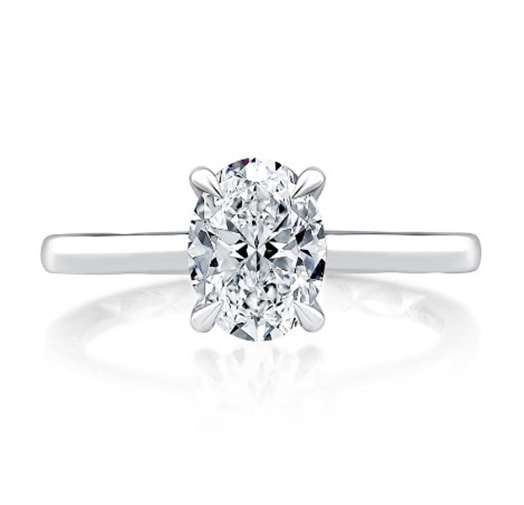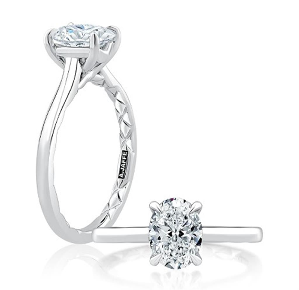 This four prong oval engagement ring showcases an oval center in a solitaire setting which lets the center stone be the star of the show. The band features a classic quilted interior that helps prevent the ring from spinning and facilitate airflow for a premium fit. Made for the modern bride, this is a sophisticated way to wear the solitaire trend.