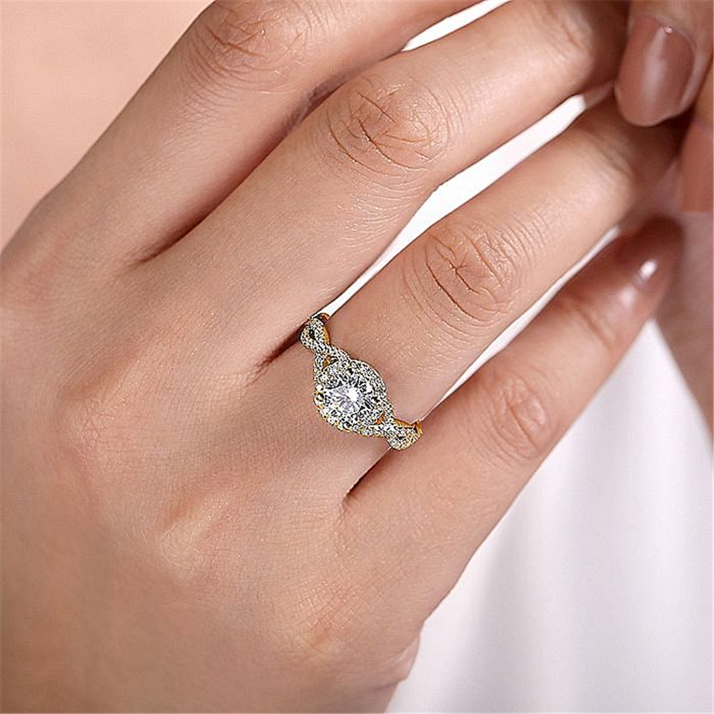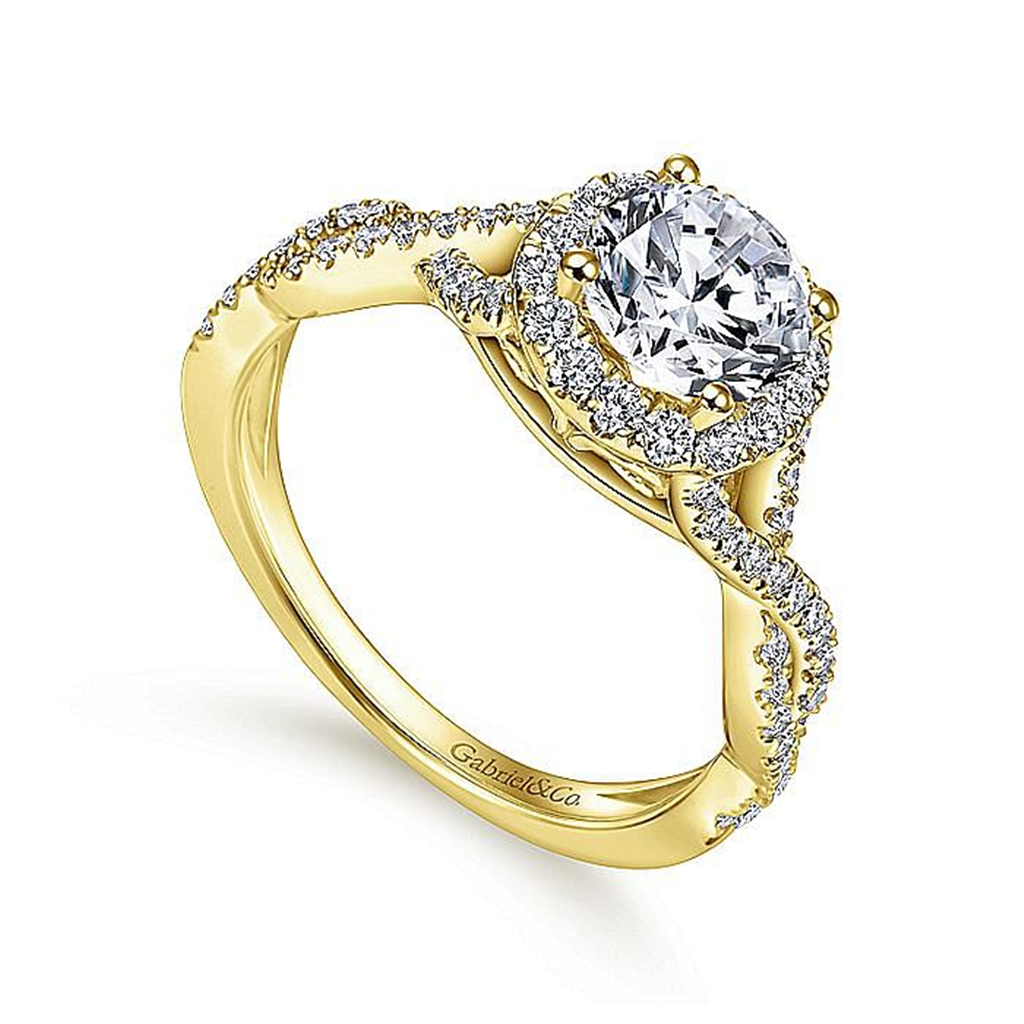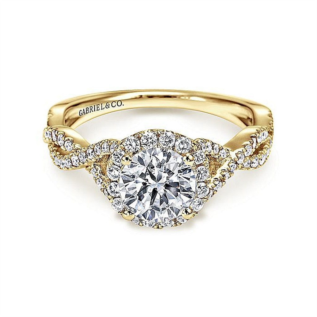 Create the ultimate memorable moment with this twisted 14K yellow gold engagement ring. Criss crossing ribbons of radiant pavé diamonds and a stunning circular halo enhance your beautiful 1ct round cut center stone. Simple yet sophisticated, this setting flaunts 0.40cts of accent diamonds.