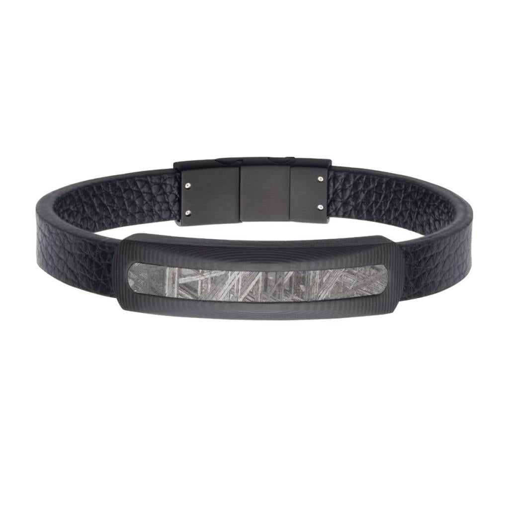 Stainless Steel Carbon Fiber 6.5mm Meteorite Inlay Black Leather Bracelet