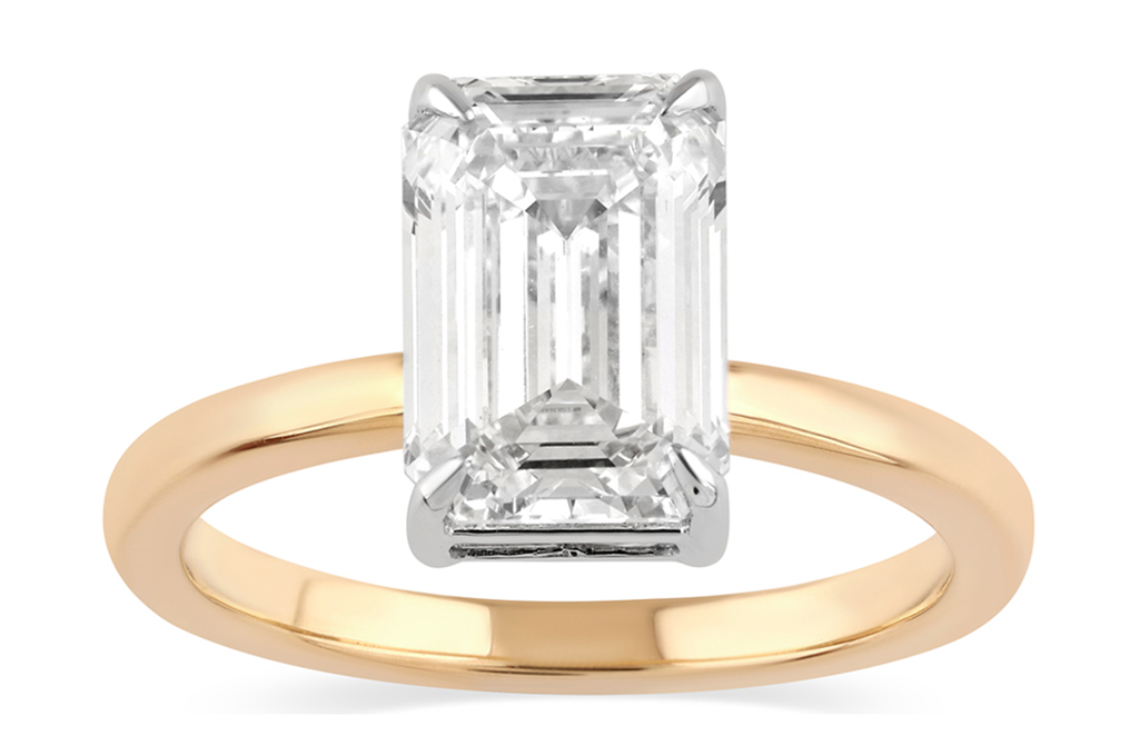 Lab Grown Diamond 14K Yellow And White Gold Hidden Halo Diamond Ring With (1) Emerald Cut Lab Grown Diamond 3.13CT E VS1 IGI And 30=0.57CTW Baguette And Round Lab Grown Diamonds Ring Size 7