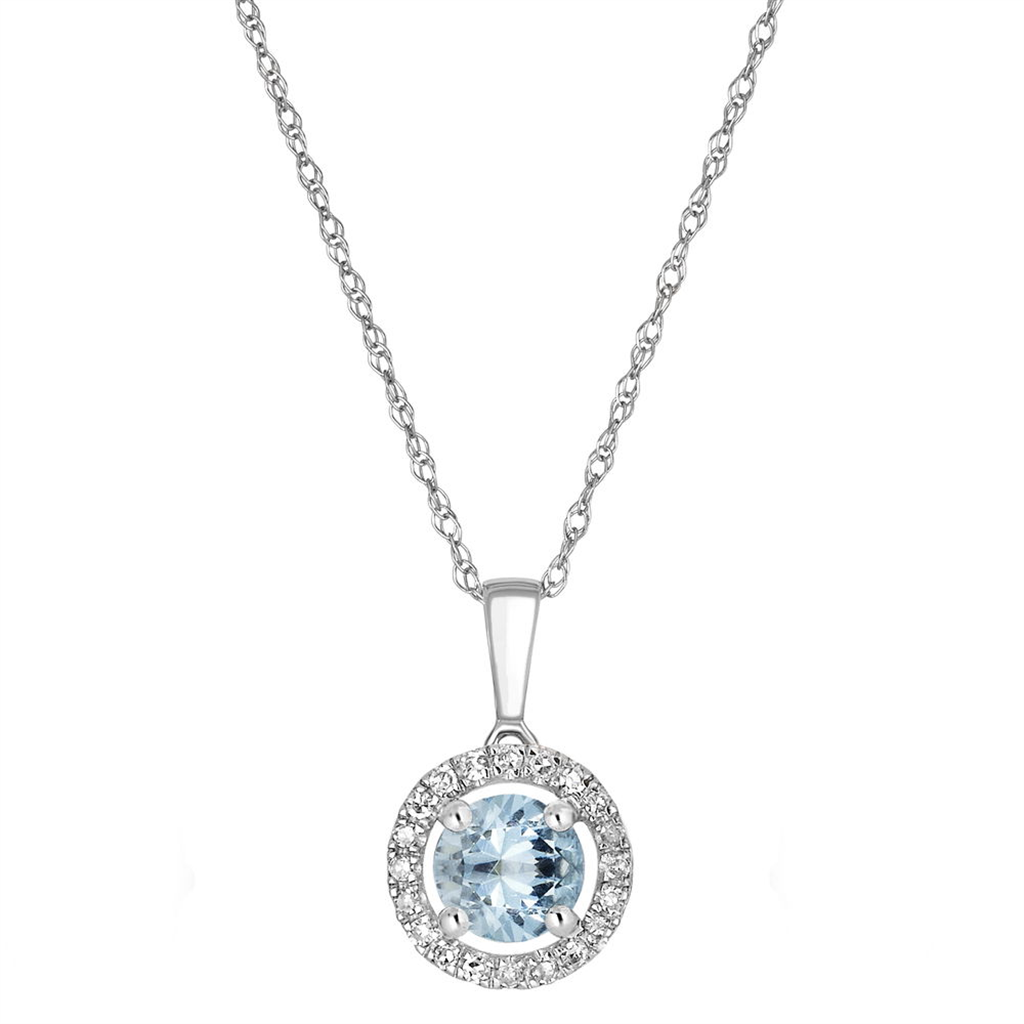 March Birthstone Pendant: 14K White Gold Diamond And Aquamarine Halo Pendant Necklace