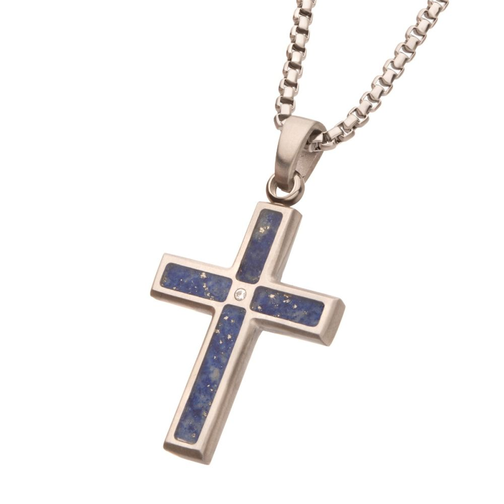 Matte Finish Stainless Steel Lapis Lazuli Stone Inlay With Lab-Grown Diamond Cross Pendant