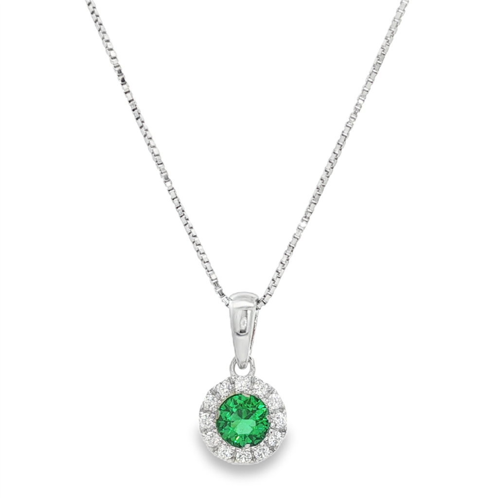 May Birthstone Pendant: Sterling Silver Lab Grown Emerald Halo Pendant Necklace