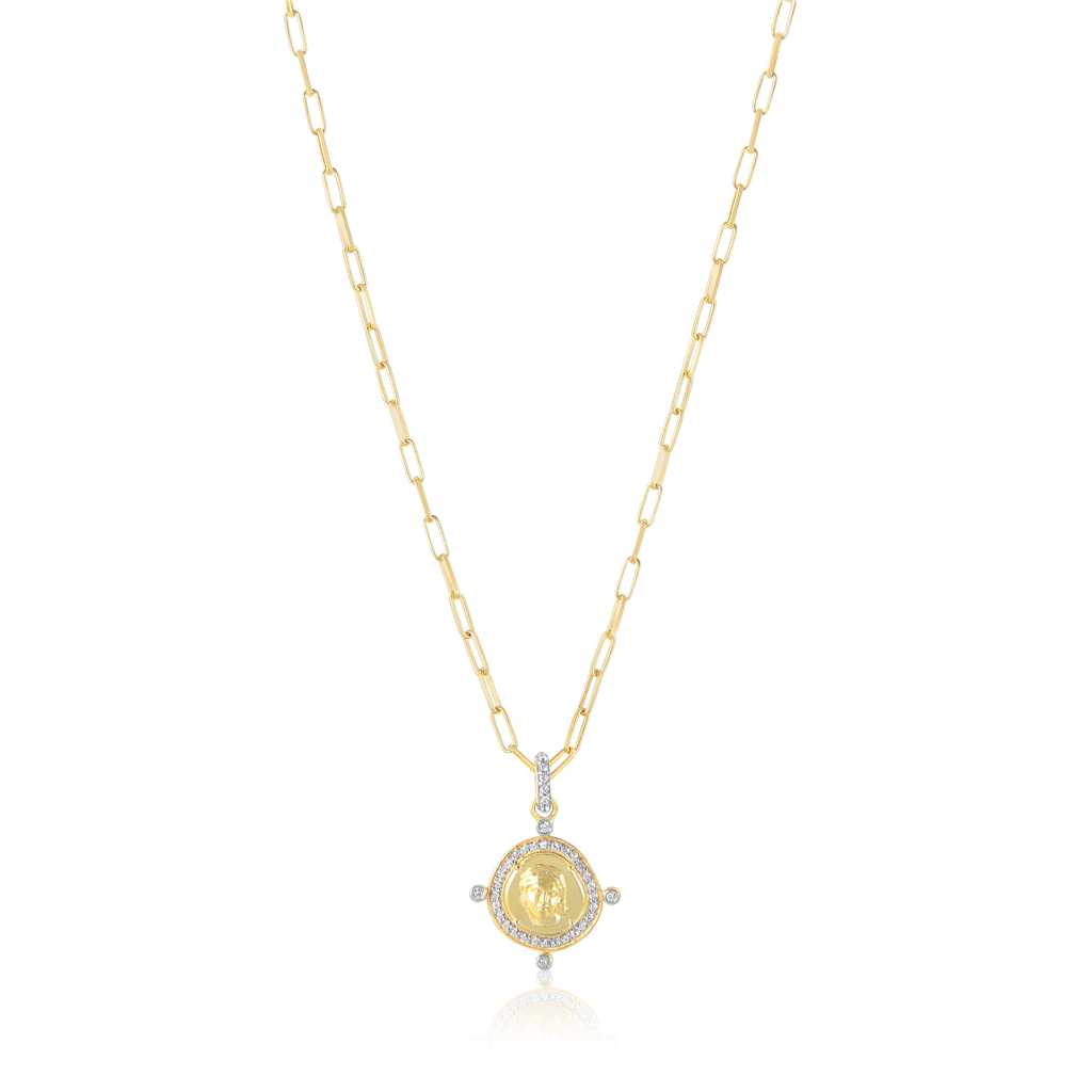 14K Yellow Gold Overlay Pave Coin Lady Charm Necklace